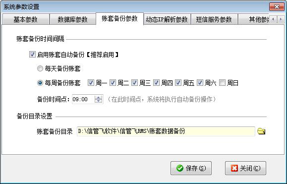 ????賬套備份參數(shù)可設(shè)置是否啟用自動(dòng)備份、備份時(shí)間間隔和備份目錄。我們強(qiáng)烈建議啟用自動(dòng)備份,以便賬套出現(xiàn)問(wèn)題的時(shí)候從賬套備份文件中恢復(fù)數(shù)據(jù)。