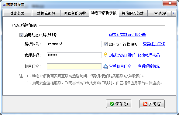 ????②解析帳號(hào)的密碼分為管理密碼和使用口令。客戶(hù)端程序登錄的時(shí)候只需要知道使用口令即可。管理密碼在系統(tǒng)參數(shù)配置中使用,由系統(tǒng)管理員掌握即可。