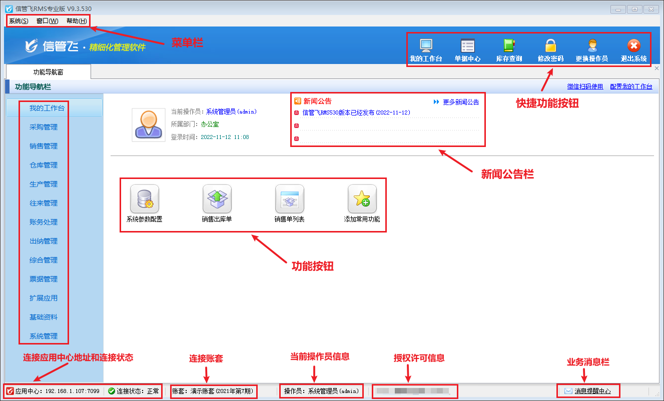 狀態(tài)欄:狀態(tài)欄顯示應(yīng)用中心地址、與應(yīng)用中心的連接狀態(tài)、當前登錄的賬套、當前操作員信息、業(yè)務(wù)提醒消息。