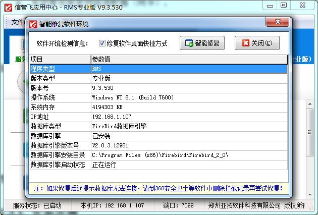 ????數據庫引擎服務顯示數據庫引擎的運行狀態,如果數據庫引擎無法正常連接,客戶端程序無法登錄,請重新安裝數據庫引擎(點菜單“工具”—》“智能修復軟件環境”中點擊“智能修復”按鈕即可重新安裝數據庫引擎)。
