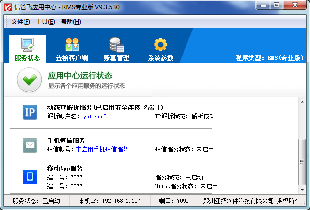 ????應用中心的運行狀態主要包括:軟件授權服務、數據庫引擎服務、動態 IP 解析服務、手機短信服務、移動 APP 服務、Web 服務(網頁查詢)、云打印服務等。部分服務在用戶購買了相應的擴展功能模塊才會顯示。