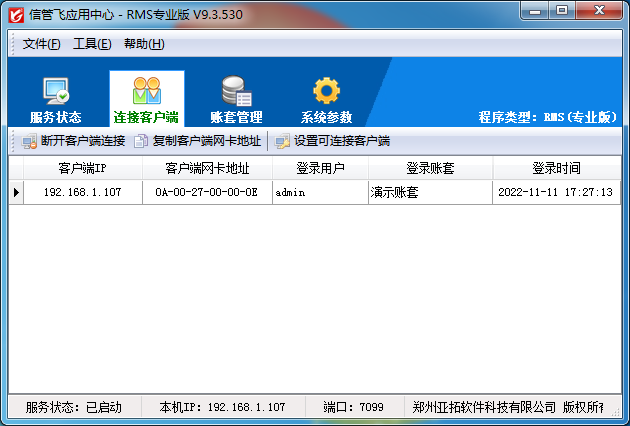 可以管理已連接到主機的客戶端電腦信息,包括客戶端 IP、客戶端網卡地址、登錄操作員、登錄賬套以及登錄時間。