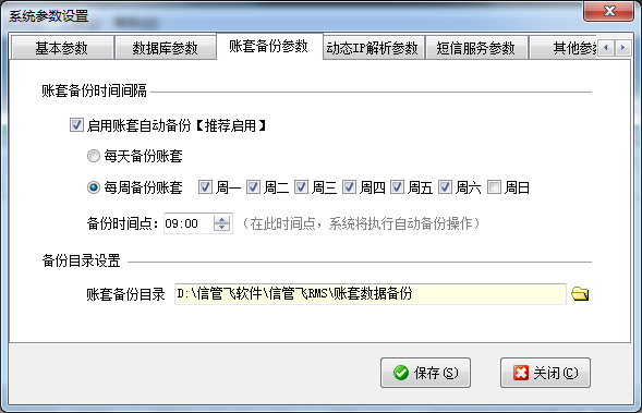 ????賬套備份參數可設置是否啟用自動備份、備份時間間隔和備份目錄。我們強烈建議啟用自動備份,以便賬套出現問題的時候從賬套備份文件中恢復數據。