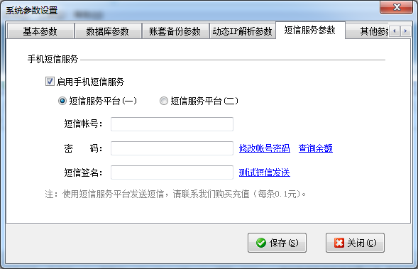 ????短信服務參數配置短信帳號和密碼(購買充值后聯系客服獲取),手機短信服務為增值服務,購買后可以發送業務通知短信、登錄驗證碼短信等。