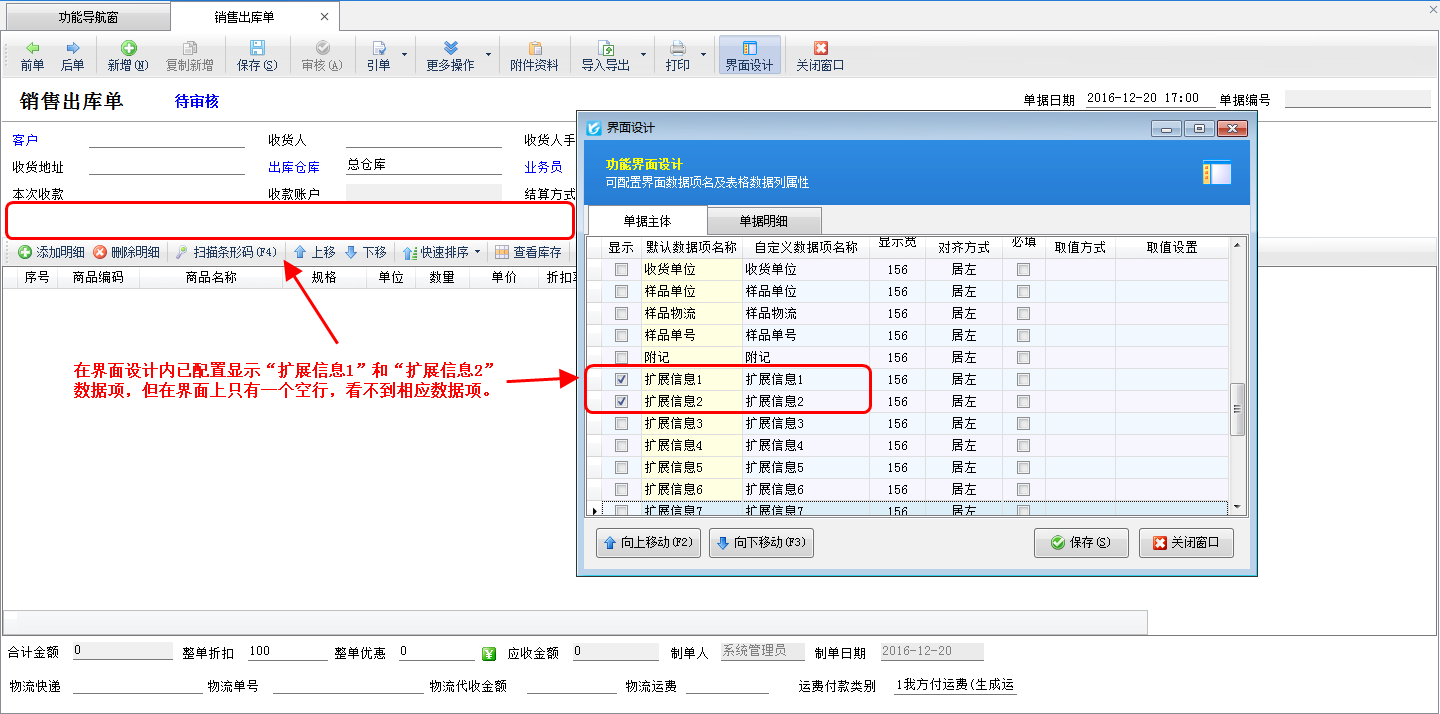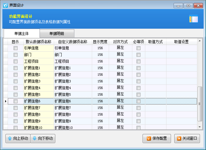 ????“單據主體”中如果打勾設置顯示數據項,但在界面上看不到,這是因為這個數據項目上方還有多個不顯示的數據項,遇到這種情況將相應的數據項向上移動,與其他需要顯示的數據項移動到一起,然后“保存配置”按鈕即可。如下圖所示,可以將“擴展信息 1”和“擴展信息 2”移動到上面即可: