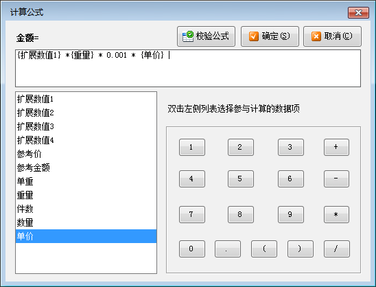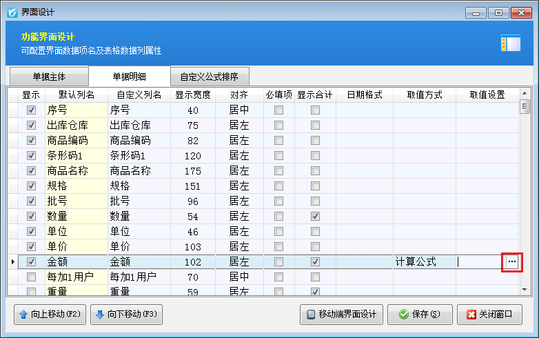 ????“單據明細”中的數據項,如果是日期類型,可以配置日期的顯示格式;部分數據項還可以設置從“基礎資料”或“數據字典”中獲取數值;數量、單價、金額這三個數據項還支持設置從計算公式中取值。