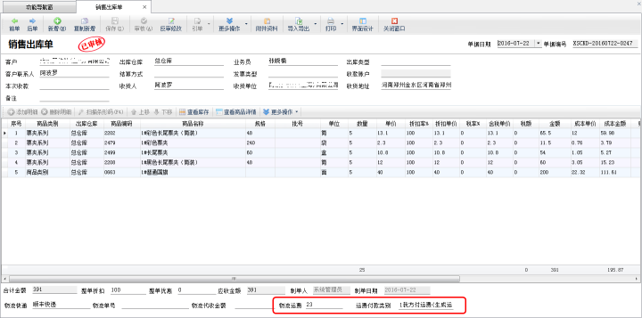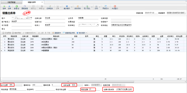 ????1、開銷售出庫單:把單據信息填好之后可以填上相應的物流公司、物流單號以及物流代收金額,通過審核后可進入物流代收結算模塊,如下圖1所示。
