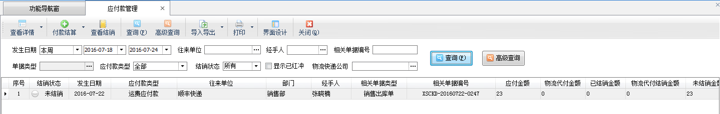 ????(1)我方付運費(生成運費應付款):運費付款類別選擇“我方付運費(生成運費應付款)”時,輸入物流運費后,保存并審核單據的時候,會生成“物流運費應付款”,在功能導航窗點“往來管理”—》“應付款管理”內對“運費應付款”進行運費付款結算即可。