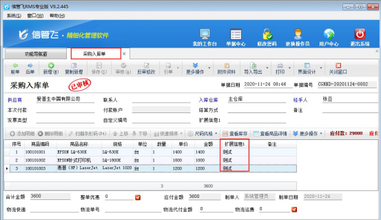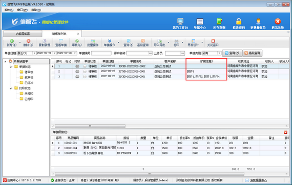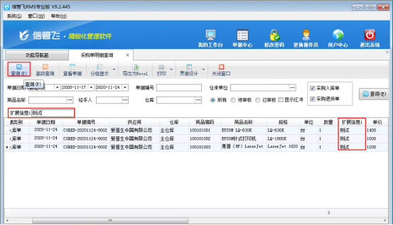 ????信管飛RMS軟件、信管飛倉庫管理軟件、信管飛送貨單軟件等支持在采購單、銷售單匯總表(送貨單匯總對賬單)、采購單、銷售單明細查詢(送貨明細對賬單)、采購訂單、銷售訂單明細表(訂單明細查詢)中設置擴展信息為查詢條件,可匯總單據明細或者單據主體項中擴展信息內容。