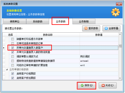 ????軟件中默認是允許開單時直接錄入新客戶/供應商的。如果該業務參數沒有被勾選,需要我們在使用此功能之前對相應的業務參數進行設置。在“業務參數”界面上我們將“開單允許直接錄入新客戶”勾選上,然后進行保存。
