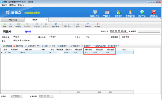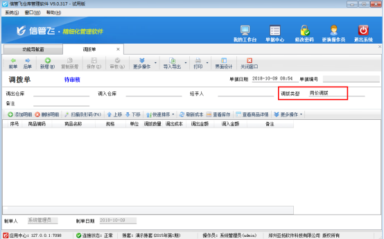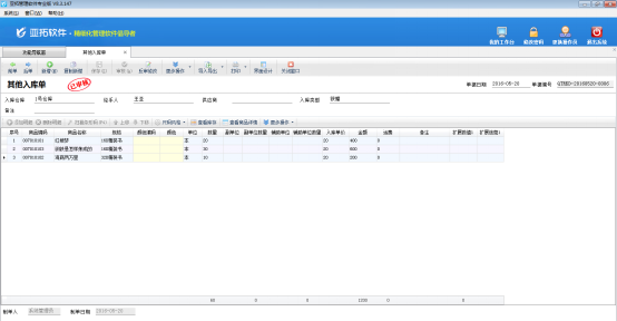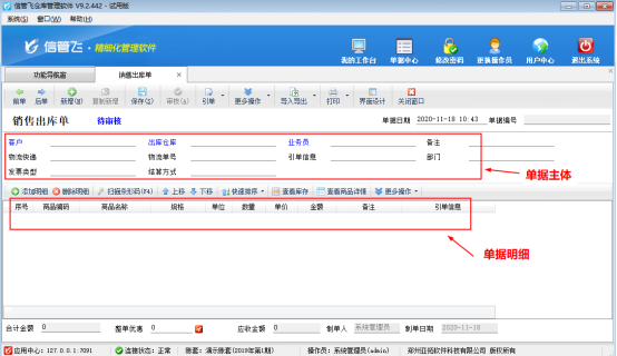 ????信管飛倉庫管理軟件業務單據的界面分為單據主體及單據明細兩部分,如圖1所示,單據默認值功能是對單據主體的部分數據項進行設置默認值,業務單據設置默認值后,每次新增單據時會顯示已設置的數據項默認值。