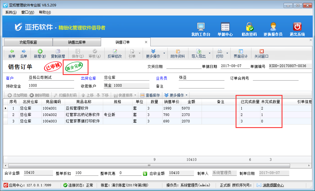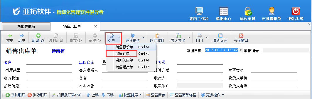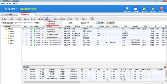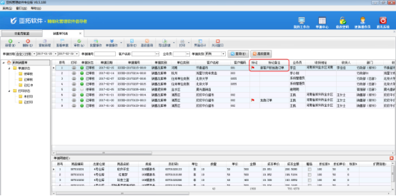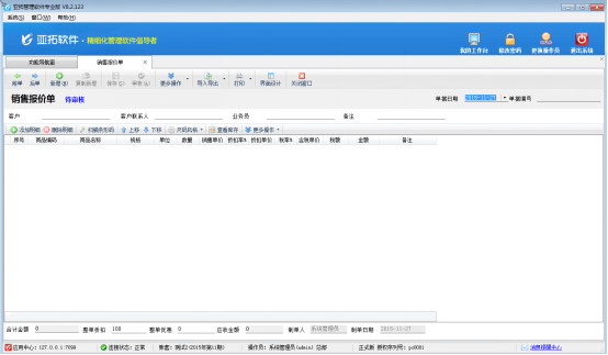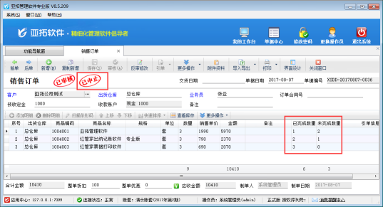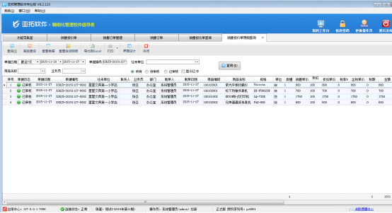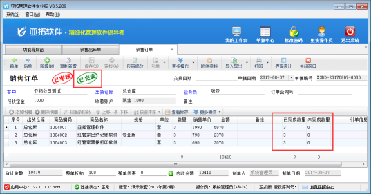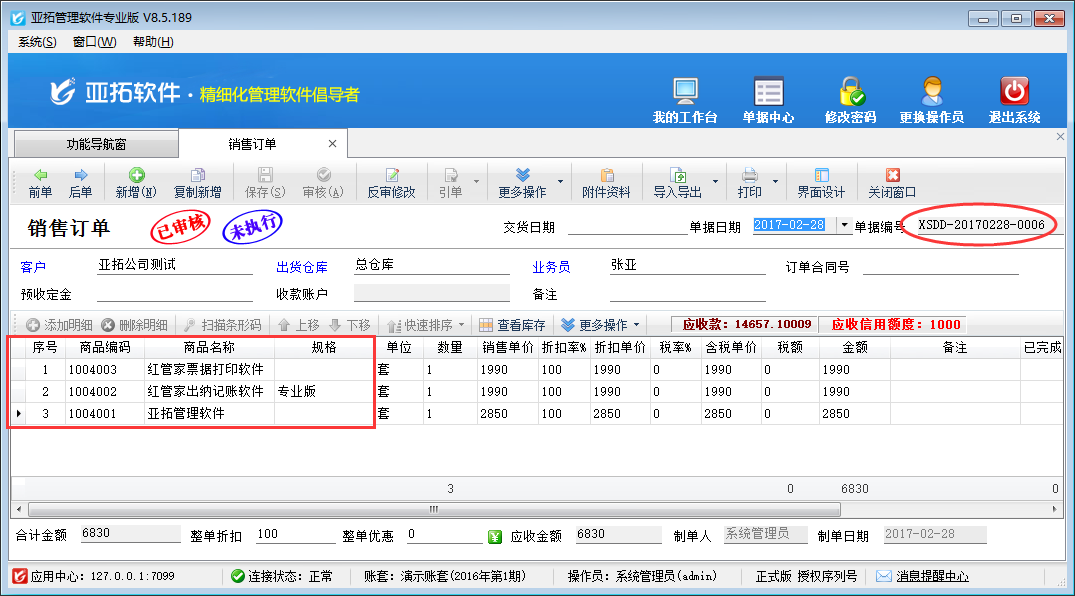 ????亞拓管理軟件星光版、標準版、專業版都支持在開采購訂單時直接引用銷售訂單明細數據,以專業版軟件為例,開采購訂單時如何直接引用銷售訂單明細數據?首先我們先開一個銷售訂單,保存并審核,如下圖所示:
