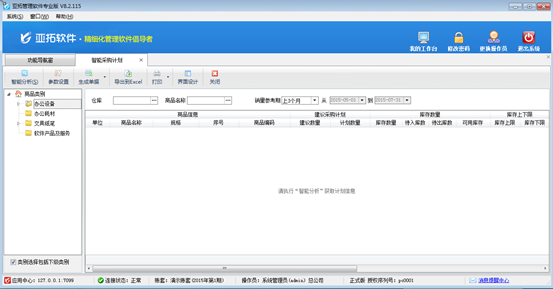 ????在功能導航窗點“采購管理”—》“智能采購計劃”即可進入本功能,如下圖所示: