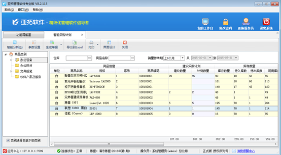????亞拓管理軟件支持由智能采購計劃生成采購計劃單。智能采購計劃功能可根據當前庫存情況,并可結合庫存上下限、同期銷售量、銷售訂單數量、待審核數量等條件進行組合運算,從而給出建議的商品采購量。可以把建議結果生成為采購訂單。智能采購計劃具體操作步驟如下: 在功能導航窗點“采購管理”—》“智能采購計劃”即可進入本功能,如下圖1所示。