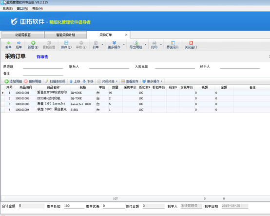 ????亞拓管理軟件和紅管家倉庫管理軟件新增采購單/銷售單后都可以直接保存并審核單據,軟件還支持批量審核采購單/銷售單,如果您每天錄單數量較多,為了節省寶貴時間提高工作效率,您可以使用批量審核采購單/銷售單功能。下面我們介紹一下在亞拓管理軟件專業版中批量審核采購單的具體的操作步驟。