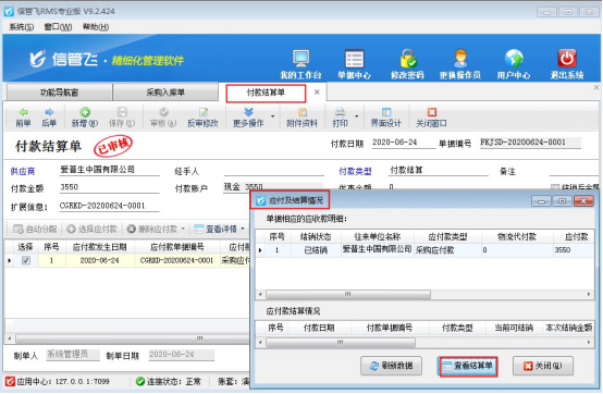 ????本篇文章以信管飛RMS為例,示范下如何修改應付款已結銷的采購入庫單單據,打開應付款已結銷的采購入庫單單據,在更多操作下點擊“查看應付款及結銷情況”,彈出應付款及結銷情況界面,點擊“查看結算單”可以打開本單據的應付款結算單界面,如下圖所示: