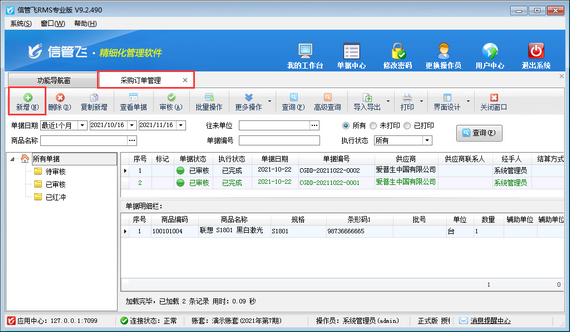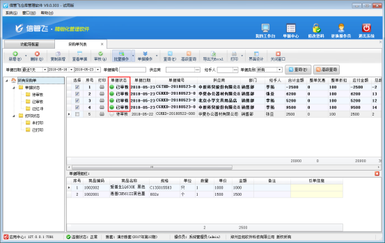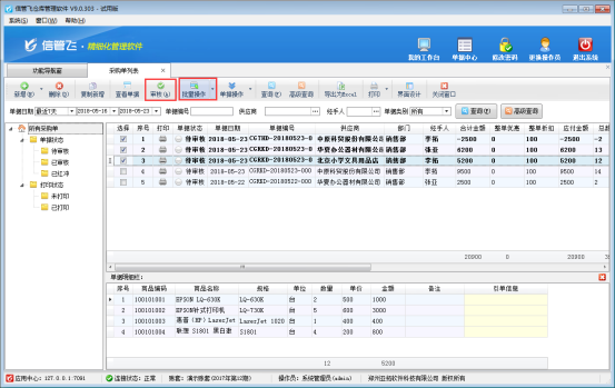 ????信管飛倉庫管理軟件、信管飛RMS軟件新增采購單都可以直接保存并審核單據,軟件還支持批量審核采購單。如果您每天錄單量較多,為了節省時間提高工作效率,可以使用批量審核功能,下邊我們在信管飛倉庫管理軟件的采購單列表中示范下如何使用批量審核功能。