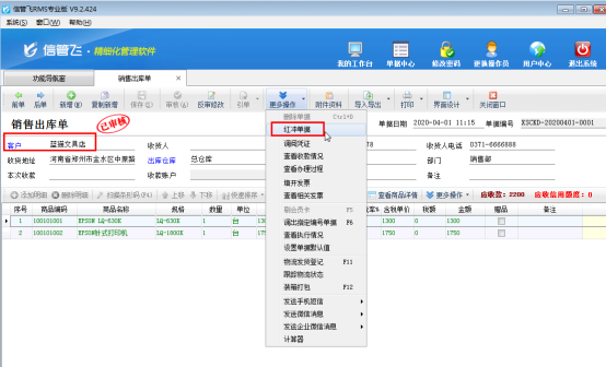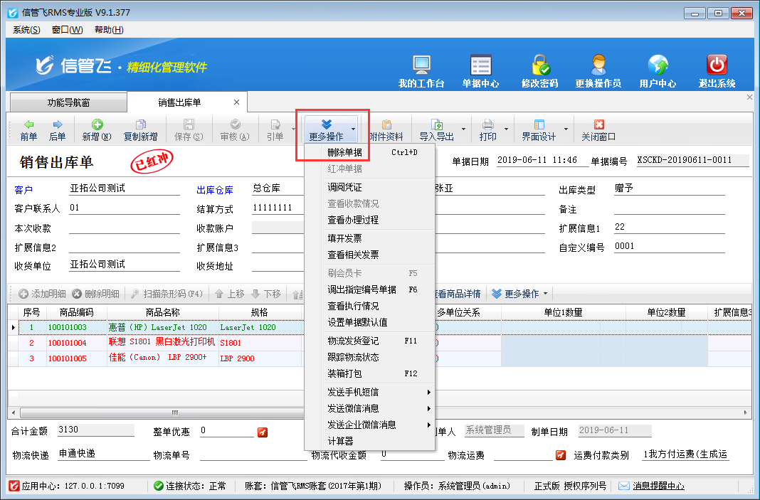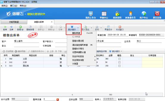 ????打開客戶名稱有誤的銷售出庫單,點擊“更多操作”—》“紅沖單據”,來將“已審核”的單據進行紅沖,紅沖后的單據會變為無效,紅沖相當于作廢,相應的應收款會刪除,之前對庫存的影響也會解除。如下圖所示: