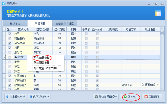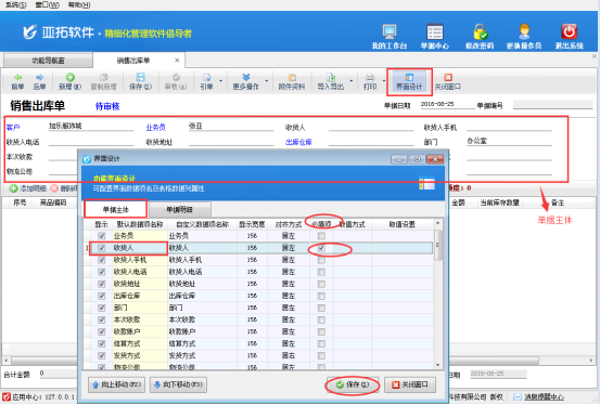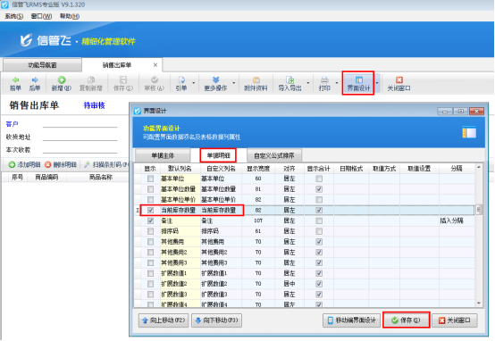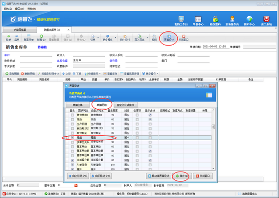 ????首先打開銷售出庫單開單界面,如下圖所示,軟件默認不顯示“贈品”項,需要先通過界面設計配置將“贈品”項勾選顯示出來。在工具欄點擊“界面設計”—》“單據明細”,找到“贈品”項,將其勾選顯示出來,然后點擊“保存”按鈕保存設置。