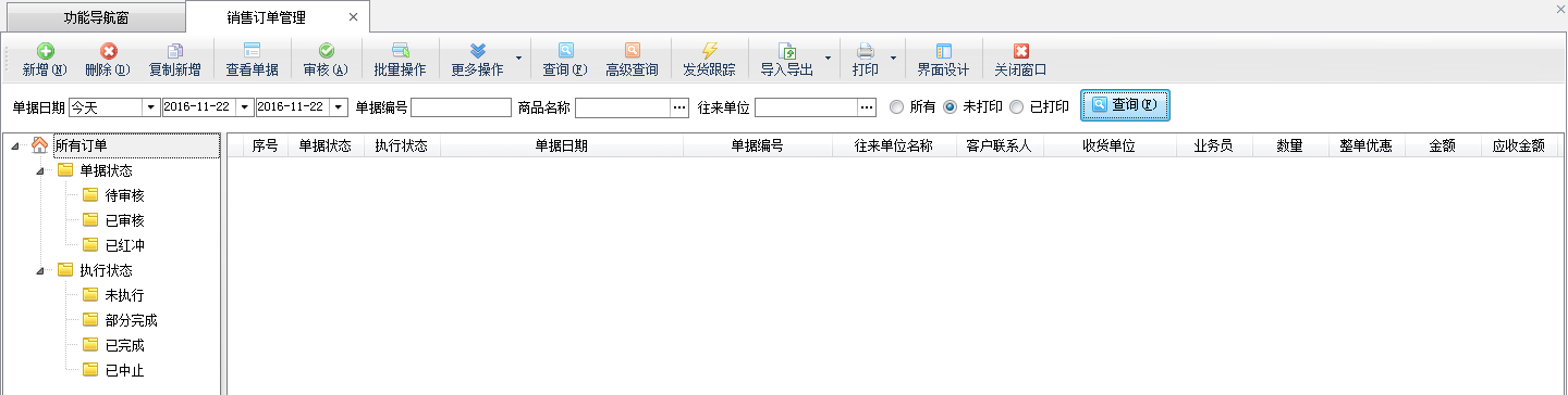 ????在功能導航窗點擊“銷售管理”—》“銷售訂單”即可進入“銷售訂單管理”功能界面(圖一),銷售訂單管理以列表的形式顯示最近的銷售訂單,根據客戶名稱、單據日期、商品名稱及其他查詢條件可查詢出某一個時間段內某個客戶的銷售訂貨情況、銷售訂單的執行情況等,在工具欄點擊“新增”按鈕即可新增銷售訂單(圖二)。