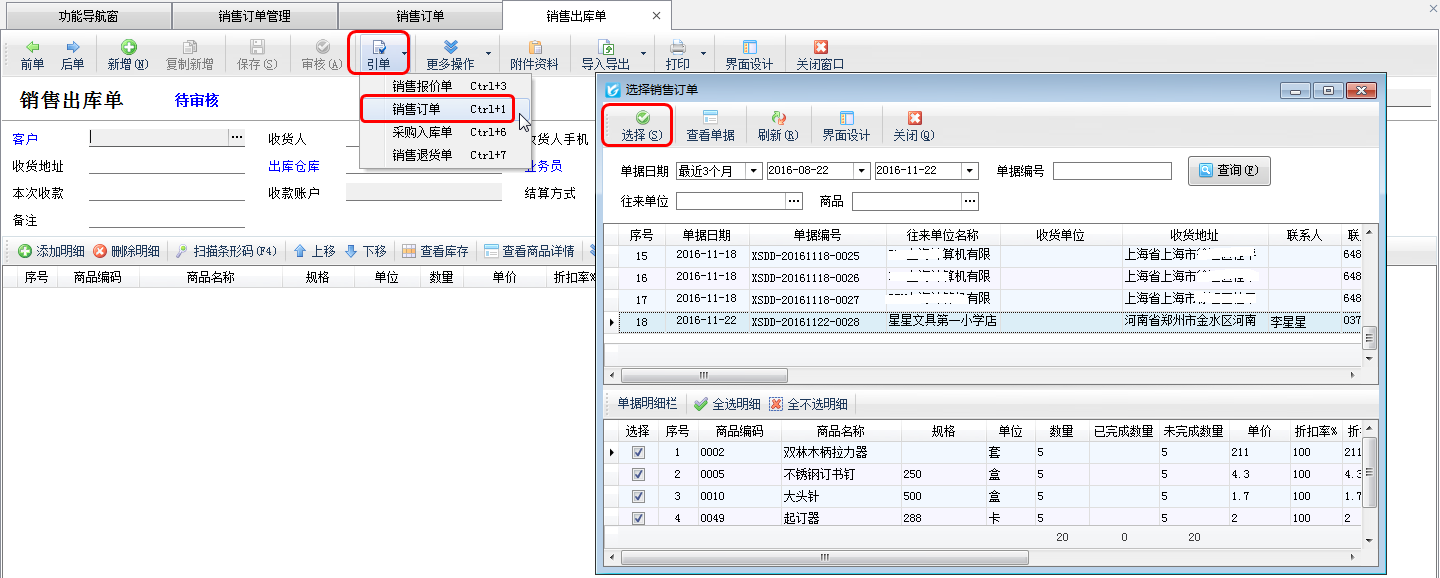 ????銷售訂單新增完成后,然后在功能導航窗點擊“銷售管理”——》“銷售出庫單”打開銷售出庫單界面新增銷售出庫單,在工具欄點擊“引單”—》“銷售訂單”可打開“選擇銷售訂單”窗口,在此窗口選擇需要發貨的銷售訂單,編輯發貨明細信息,然后保存審核出庫即可。