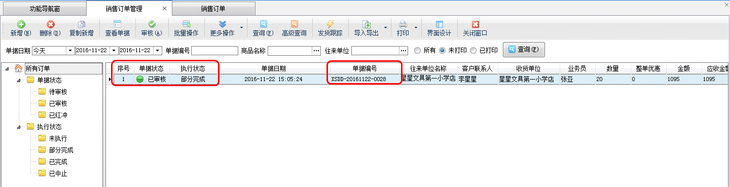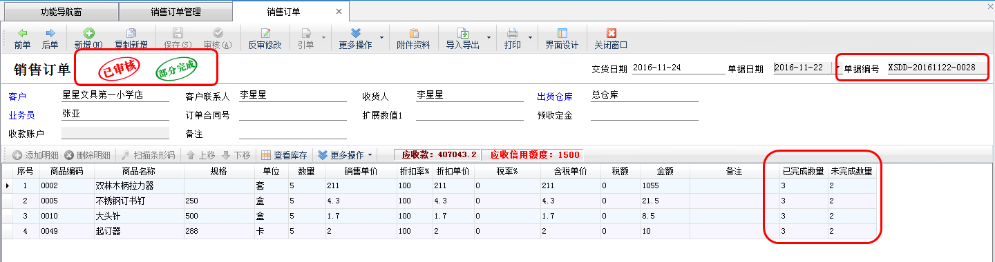 ????“銷售出庫單”引用“銷售訂單”出庫后,在銷售訂單管理界面查看銷售訂單執行狀態會變為“已完成”或者“部分完成”狀態。點擊“查看單據”按鈕重新打開“已完成/部分完成”的銷售訂單,可以查看銷售訂單的完成情況(已完成數量/未完成數量)。