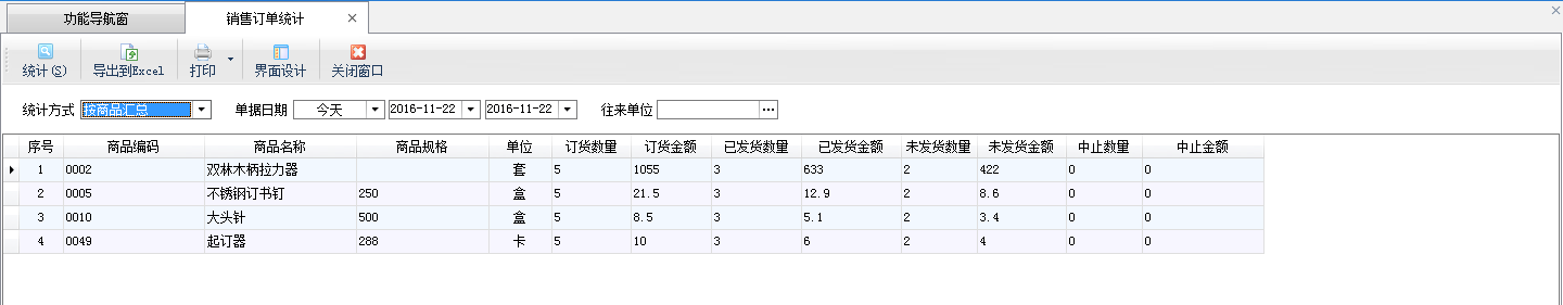 ????銷售訂單統計:可以從商品、業務員、往來單位三種角度匯總銷售訂貨情況、已發貨情況、未發貨情況和中止情況。點“統計方式”可以選擇具體的統計方式,默認會按照商品進行統計。
