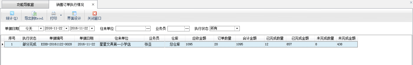 ????在銷售管理模塊“相關統計查詢”內可以查看銷售訂單統計表及銷售訂單執行情況統計表等。