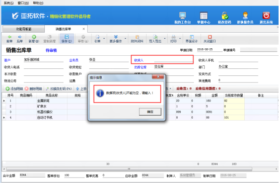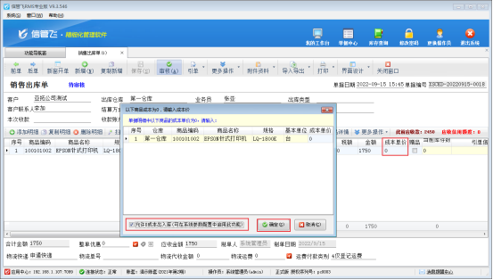 ????設置完成后,在功能導航窗點擊“銷售管理”—》“銷售出庫單”,新開銷售出庫單,此時如果商品的成本單價為0,審核單據時會出現“以下商品成本價為0,請輸入成本價”的提示信息,這時需要勾選左下方允許0成本出入庫,之后點擊“確定”,單據可審核成功,如下圖所示: