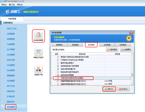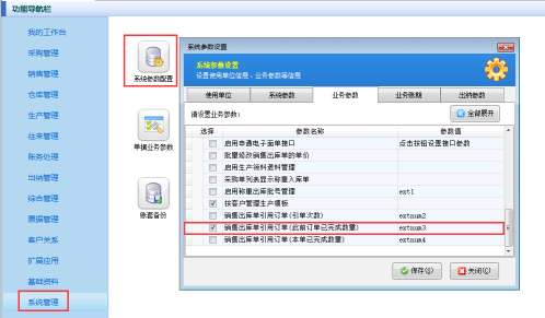 ????在功能導航窗點擊“系統管理”—》“系統參數配置”,進入系統參數配置界面,點擊“業務參數”,勾選“銷售(采購)退貨單可引用訂單”參數,點擊保存按鈕,如下圖所示: