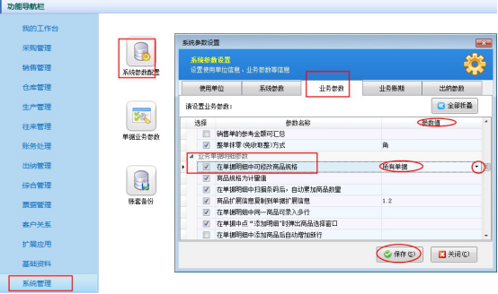 ????如何設置輸入商品時自動檢索,操作步驟如下,在功能導航窗點擊“系統管理”—“系統參數配置”,在“業務參數”的選擇參數中取消勾選參數“在選擇窗口可查看庫存數量”和“在選擇窗口可查看庫存可用數量”,然后保存設置,如下圖所示: