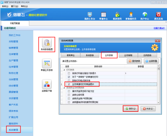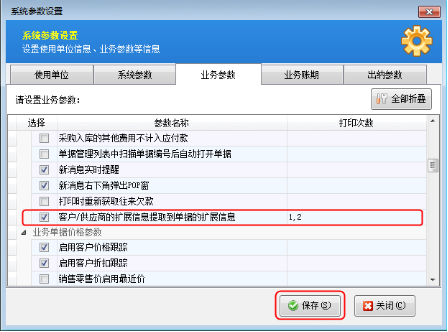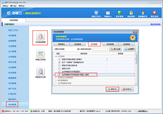 ????在功能導航窗點擊“系統管理”—》“系統參數配置”—》“業務參數”,在“打印參數”中啟用參數“業務單據可打印綁定客戶微信二維碼”,然后保存設置,如下圖所示。