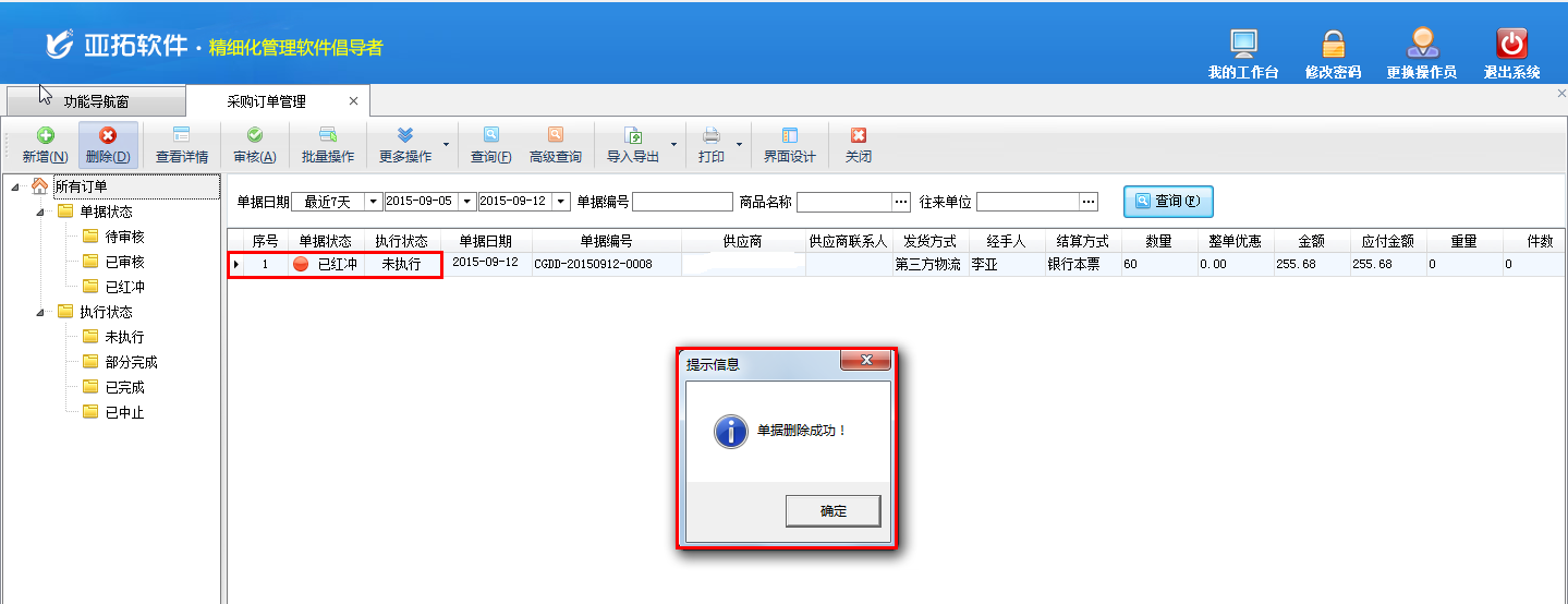 ????單據紅沖后即可進行刪除操作,如下圖所示: