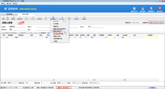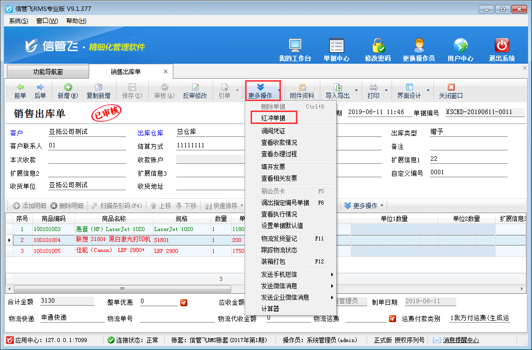????業務單據已審核后默認是不允許刪除的,如果需要刪除,需要先紅沖此單據,然后再刪除,即可刪除成功,在單據界面工具欄點擊“更多操作”—》“紅沖單據”即可紅沖單據,如下圖所示: