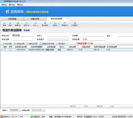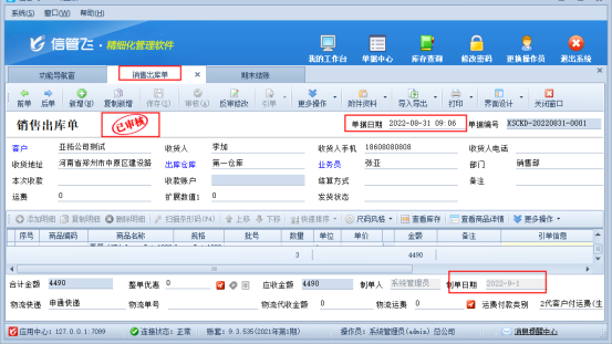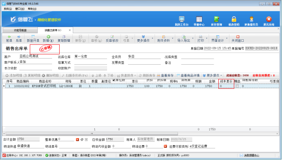 ????反結賬操作完成,返回銷售開單界面重新保存補錄8月份的單據,可以正常保存審核。如下圖所示: