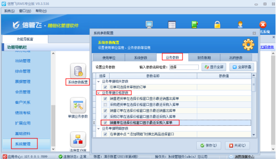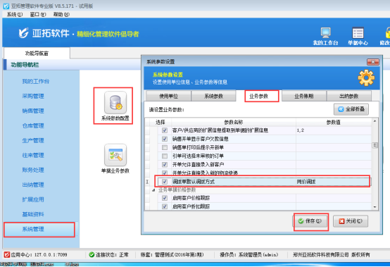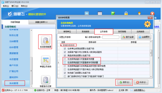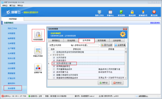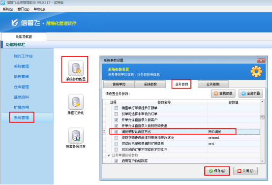 ????在功能導航窗點擊“系統管理”—》“系統參數配置”—》“業務參數”,進入“業務參數”配置界面,在庫存管理參數中找到并勾選參數“允許0成本出入庫”,之后點擊“保存”,如下圖所示: