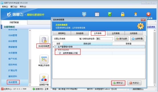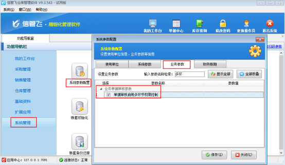 ????軟件多級審核最多支持5級審核,支持設置各類單據。本文以“銷售出庫單”為例示范。首先需啟用參數,在功能導航窗點“系統管理”→“系統參數配置”→“業務參數”,勾選“單據審核啟用多環節權限控制”,點擊“保存”按鈕,如下圖所示: