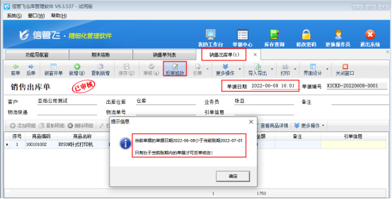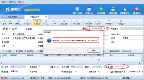 ????信管飛RMS專業版軟件在補錄之前日期單據保存時,提示以下消息“單據日期【2022-08-31】不能小于本期開始日期【2022-09-01】”,如下圖所示,出現此提示該如何解決?本文進行示范操作。