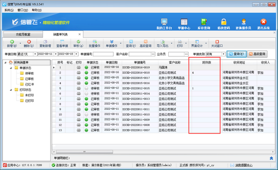 ????在銷售單列表同樣可以直接查看單據相應的附件資料文件名,如下圖所示。