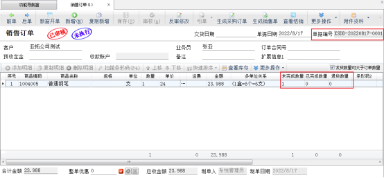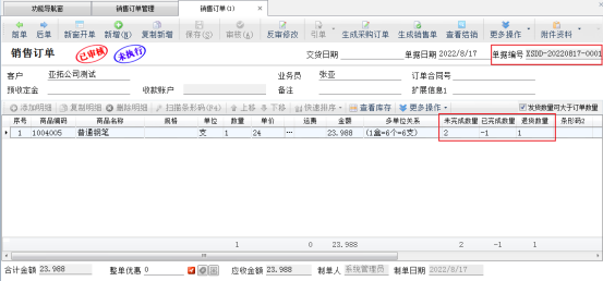????銷售退貨單引單訂單審核完成后,進入銷售訂單管理界面,打開引單過的銷售訂單,可以看到訂單的完成數量以及退貨數量已更新。