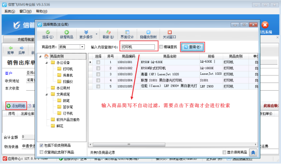 ????信管飛RMS軟件開單前可提前維護好商品信息到基礎資料中,新開單據選擇客戶后,點擊“添加明細”可彈出選擇商品界面,可選擇添加好的商品信息,有用戶反映在選擇商品界面,查詢窗口輸入商品簡寫不自動過濾,需要點擊下查詢才會進行檢索,如下圖所示: