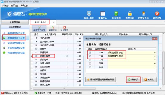 ????系統參數設置完成后,在“系統管理”→“單據業務參數”中選擇左側工具欄的“單據審核環節設置”,選擇“銷售出庫單”,點擊“單據環節設置”,啟用“一審”和“二審”并設置對應審核環節的審核人員“張亞”和“李拓”,然后保存設置,如下圖所示: