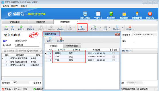 ????關閉當前單據界面。點擊“更換操作員”,切換為“二審”操作員“李拓”登錄軟件,在銷售管理→銷售單列表找到相同單據打開,點擊“審核”按鈕,軟件會更新審核狀態由“一審”變為“已審核”,在工具欄“更多操作”下點擊“辦理過程”,能一目了然看到這個單據在每個審核環節操作的信息。如下圖所示: