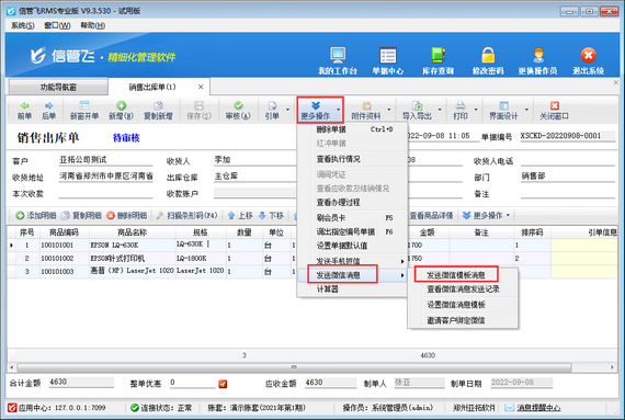 ????微信消息服務是信管飛軟件基于微信開放平臺研發的業務消息發送服務,支持即時推送業務單據消息,如訂單通知、發貨信息等。支持客戶查看消息詳情(可配置外部查看數據項)、單據簽收確認、分享轉發等功能。如下圖所示,本篇文章介紹一下信管飛RMS如何設置操作員不可發送微信消息?