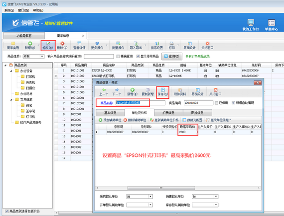 ????在功能導航窗點擊“基礎資料”—》“商品信息”即可打開“商品信息”界面,然后選擇商品,點擊“修改”按鈕,在“單位及價格”標簽頁可設置商品“最高采購價”,如下圖所示,設置商品“EPSON針式打印機”最高采購價為2600元。
