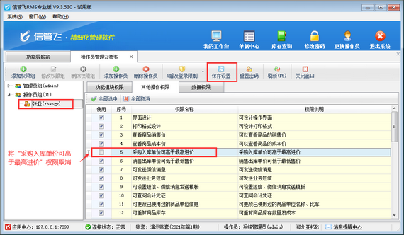 ????在功能導航窗點擊“系統管理”—》“操作員及授權”,進入“操作員管理及授權”界面,選擇操作員賬號,然后在“其他操作權限”界面將“采購入庫單價可高于最高進價”權限勾選取消,然后保存權限設置,如下圖所示,設置操作員“張亞”采購入庫單價不可高于最高進價。
