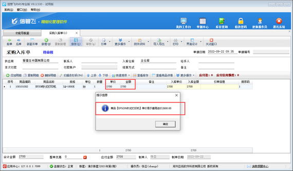 ????設置完成之后,使用操作員賬號“張亞”登錄軟件,新增一個采購入庫單,選擇商品“EPSON針式打印機”以2700元(最高采購價2600元)的采購單價進行采購入庫,保存單據時,系統會彈出提示信息“商品【EPSON針式打印機】單價高于最高進價2600元”,無法保存,如下圖所示。