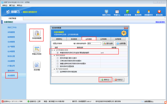 ????在功能導航窗點擊“系統管理”—》“系統參數配置”—》“業務參數”打開業務參數配置界面,在“業務單據相關參數”內啟用參數“單據保存附件資料文件名的擴展信息數據項”,并設置參數值,默認是“ext1”(單據主體.擴展信息1)。