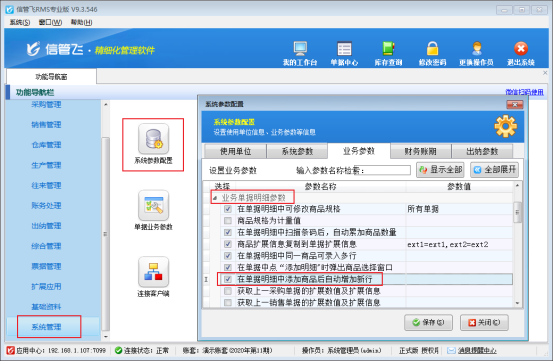 ????在功能導航窗點擊“系統管理”—》“系統參數設置”—》“業務參數”,然后在業務單據明細參數中啟用“在單據明細中添加商品后自動增加新行”參數,如下圖所示: