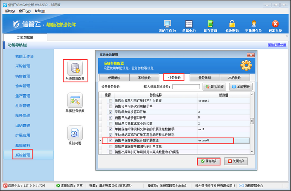 ????在功能導航窗點擊“系統管理”—》“系統參數配置”—》“業務參數”打開業務參數配置界面,在“業務單據相關參數”內啟用參數“銷售單保存稅額合計到擴展數值”,并設置參數值,默認是“extnum5”(單據主體.擴展數值5)。
